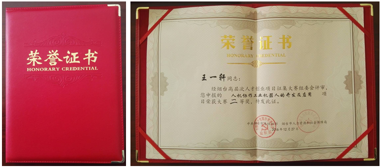 2016年12月27日,煙臺市高層次人才創(chuàng)新創(chuàng)業(yè)項目大賽在市中心大酒店隆重舉行,經(jīng)過激烈角逐,我公司王一軒博士申報的《人機協(xié)作機器人的開發(fā)與應用》在165個參賽項目中脫穎而出,榮獲大賽二等獎(共5名)
