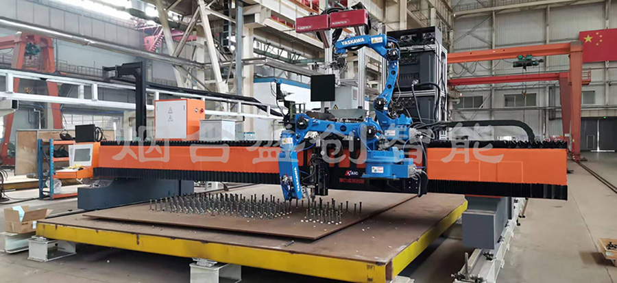 我公司自主研發(fā)的剪力釘(帶瓷環(huán))自動焊接機(jī)器人設(shè)備,采用數(shù)控龍門、工業(yè)機(jī)器人、工業(yè)視覺等技術(shù),可完全取代人工,實(shí)現(xiàn)鋼板自動除銹、焊點(diǎn)自動定位、剪力釘和瓷環(huán)自動上料、自動配合、自動焊接的全自動作業(yè)流程。設(shè)備可用于平板、弧形板、異形板的自動焊接。